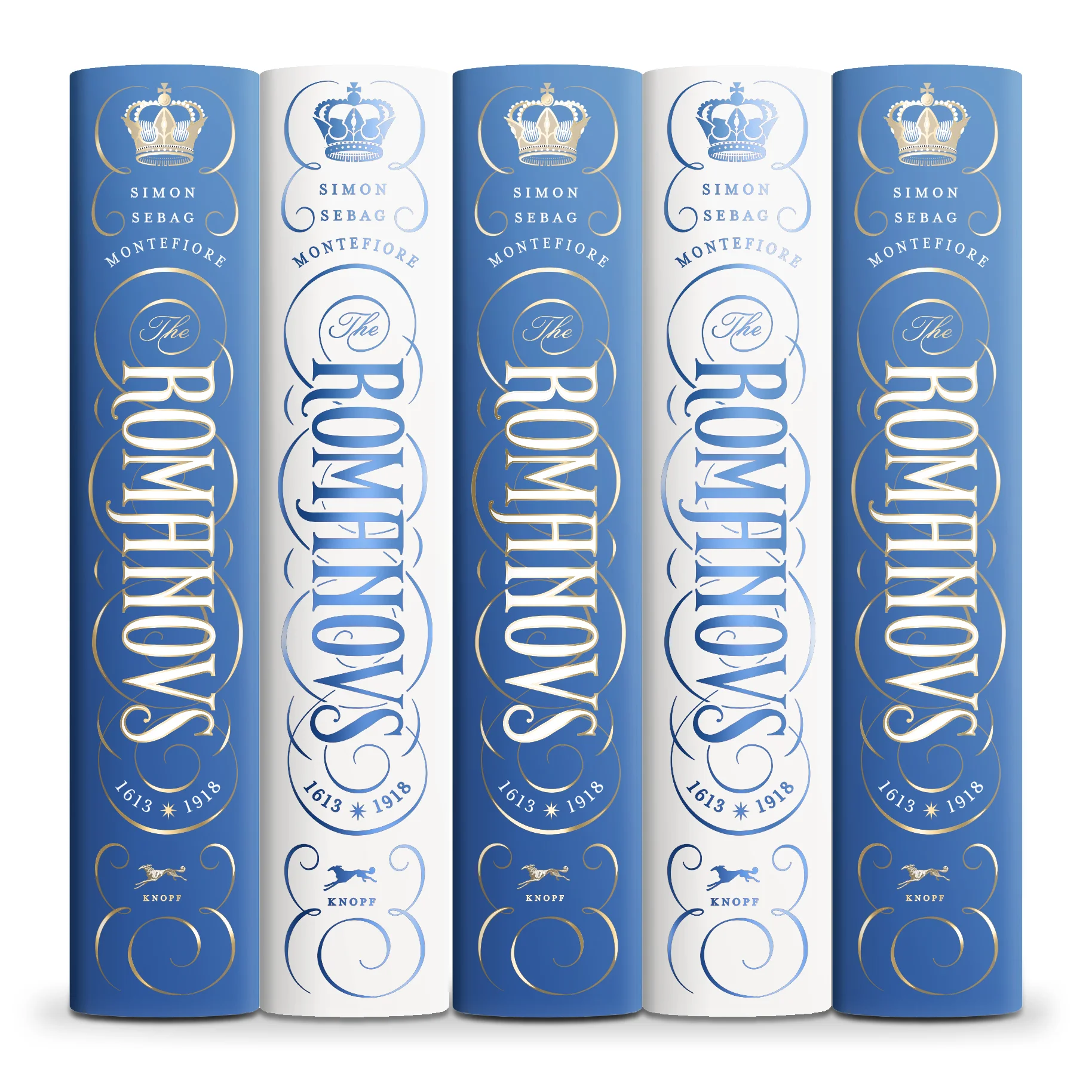The white case was blind-debossed with a simplified version of the front cover art art; while its spine was stamped in blue foil—shown below next to the spine on the jacket.